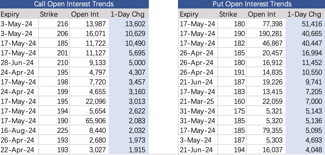 For put options, investors heavily sold the $IWM 20240517 180.0 PUT$ with a 180 strike expiring May 17, adding 51,000 contracts. Combined with $IWM 20240517 190.0 PUT$ , this put spread suggests expectations for IWM to drop 1.5% by mid-May.