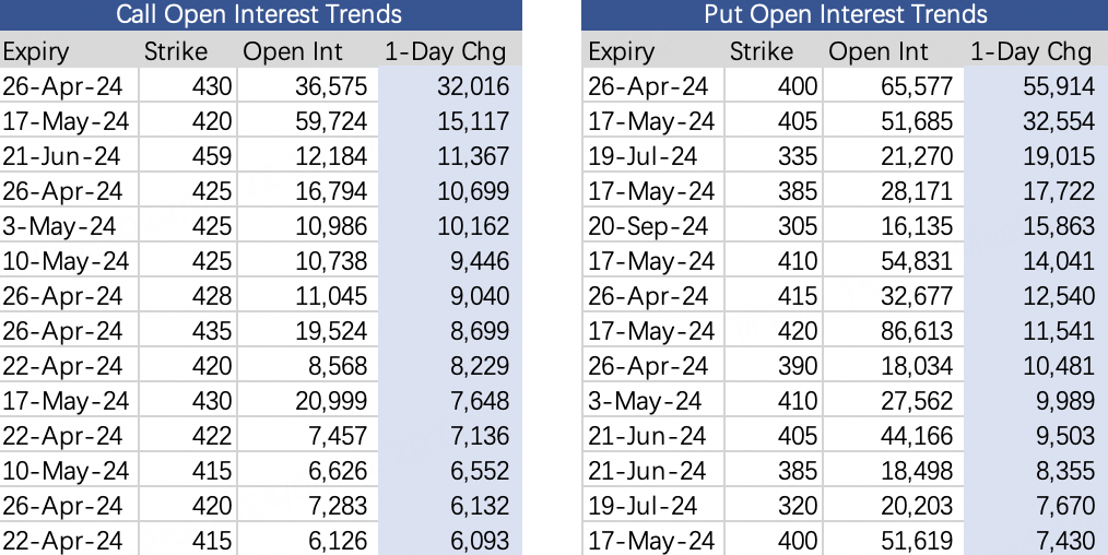 For put options, investors sold the most new $QQQ 20240426 400.0 PUT$ , with a 400 strike expiring April 26, adding 55,000 contracts, implying expectations for QQQ to fall 3.3% this week. The $QQQ 20240517 405.0 PUT$ expiring May 17 added 32,000 contracts, suggesting QQQ is expected to drop 2.1% by mid-May.