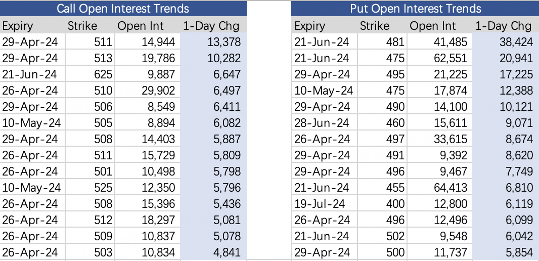 For call options, investors bought the most new $SPY 20240503 525.0 CALL$ with a 525 strike expiring May 3, adding 8,992 contracts. This suggests expectations for a 3.9% rally in SPY by early May.