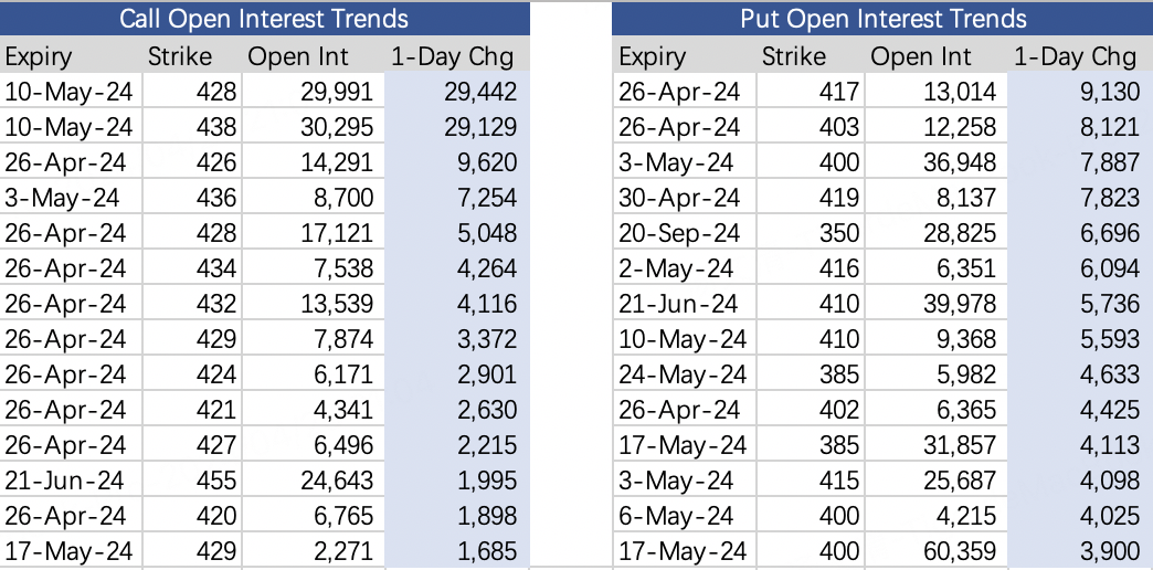 For call options, investors bought the most new $QQQ 20240517 425.0 CALL$ with a 425 strike expiring May 17, adding 16,000 contracts. Combined with the QQQ 20240517 425.0 PUTs, this straddle initiation signals expectations for a move over 3.7% in QQQ by mid-May.