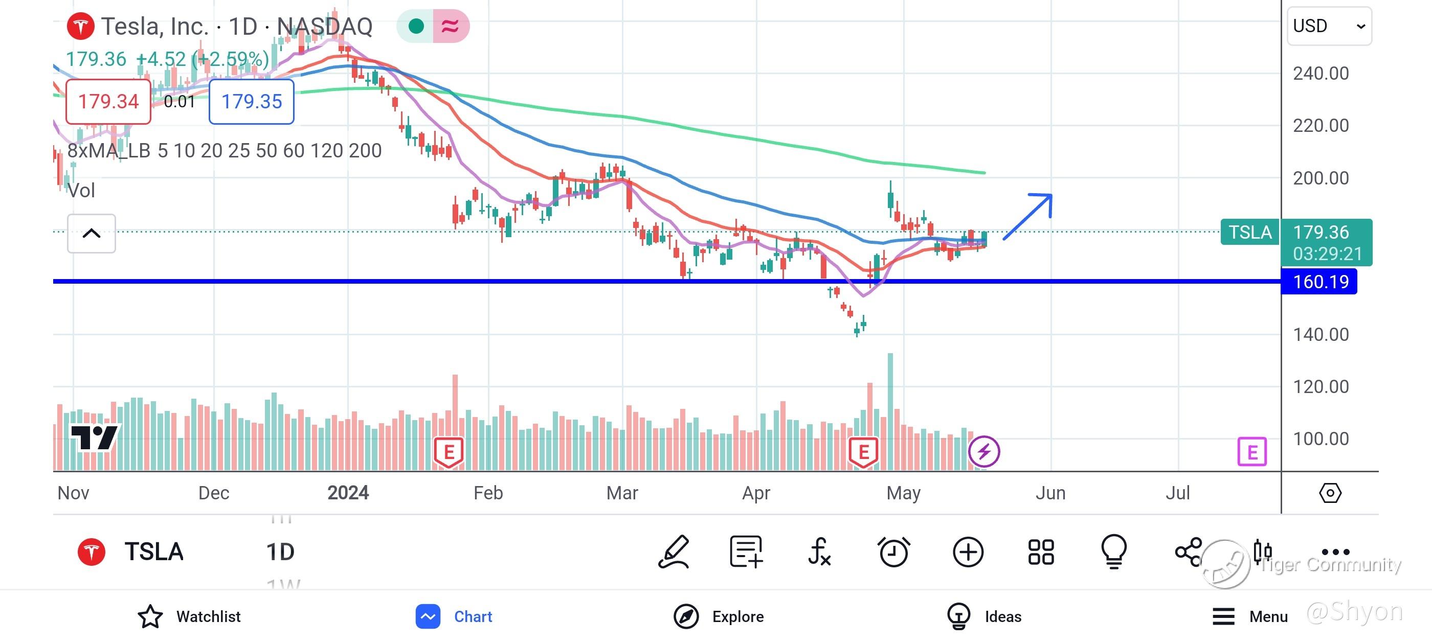 For Tesla, the share price pullbacked for over 2 weeks after being rejected somewhere nearby EMA200 trend line resistance. Last night, Tesla stood back onto the EMA50 trend line, which is a premier indicator of a potential rebound. Moreover, all EMA lines are well aligned and stay very close to each other. I believe, with high possibility, EMA25 (red line) will golden cross over EMA50 (blue line) next week, forming a bullish uptrend for short term $Tesla Motors(TSLA)$