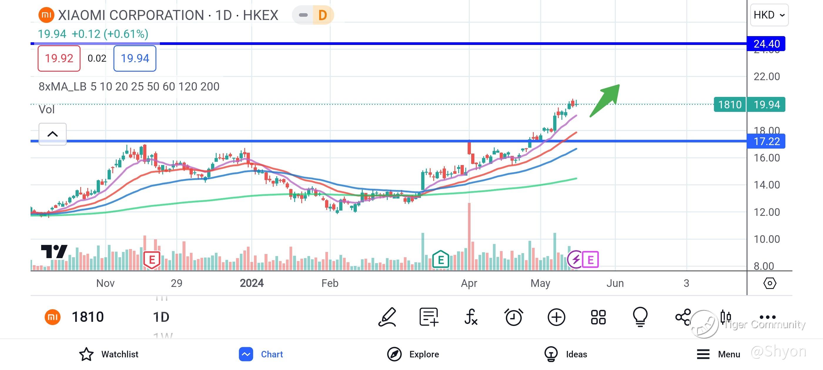 If you compare Xiaomi's chart with Tesla and BYD, Xiaomi wins largely! After being undervalued and oversold for over 3 years, Xiaomi rebounded strongly since February this year. The share price stays above its EMA10 trend line, for over 3 weeks, which is an extremely bullish sign for the stock. For short term, I remain my bullish view on $XIAOMI-W(01810)$