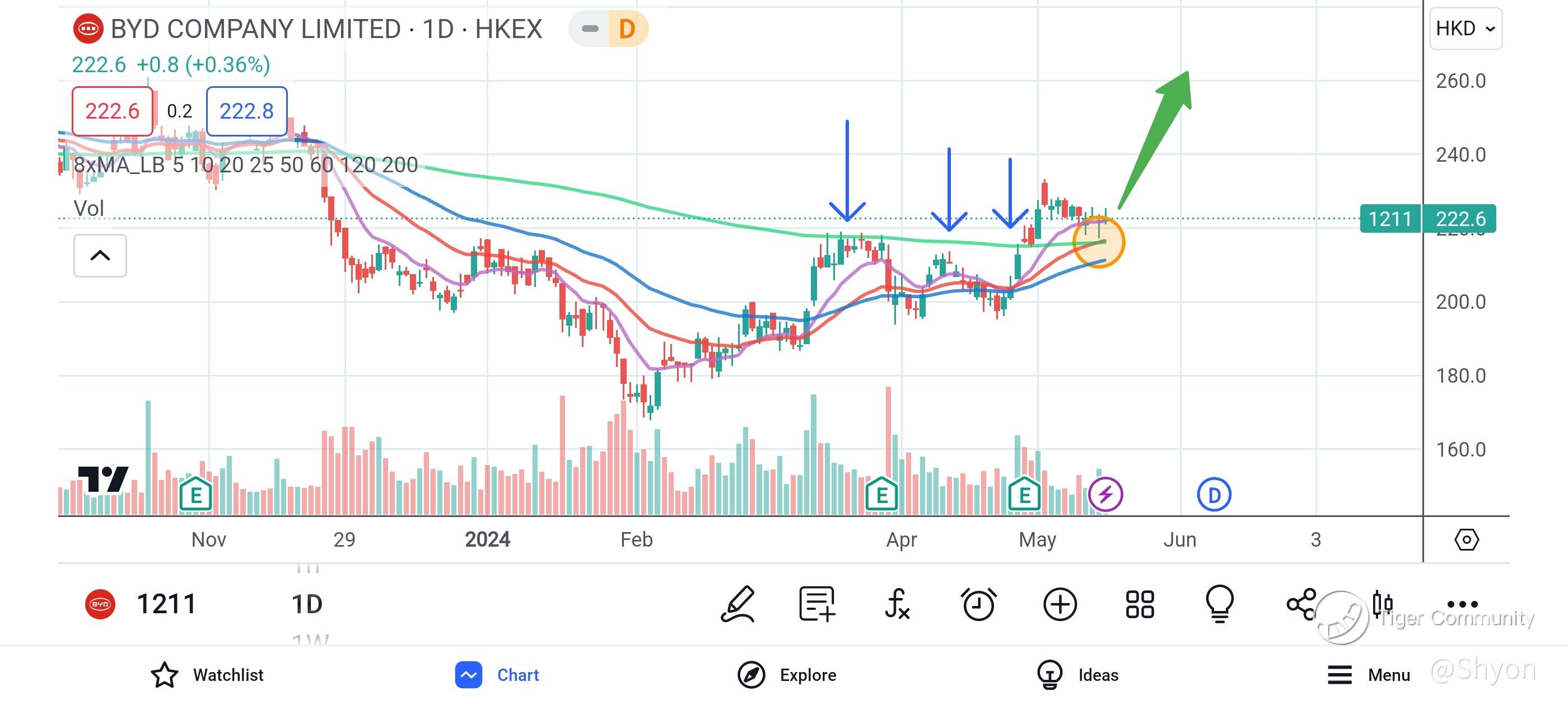 For BYD, the chart is well setup! After being rejected 3 times by the EMA200, the share price managed to break through this ultra strong resistance and hold pretty well there. Last night, we had EMA25 golden crossed over EMA200 as well, which signified a firm trend reversal in BYD share price. Moving forward, I strongly believe BYD will be on bullish $BYD COMPANY(01211)$