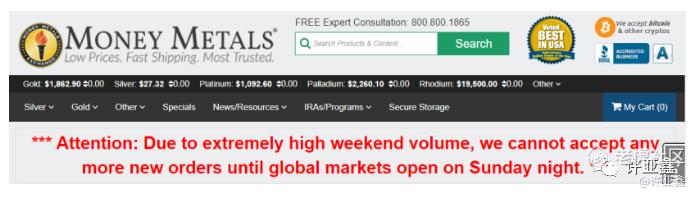 受銀價大幅波動影響,1月30日美國多個主要貴金屬零售網站暫停銷售白銀產品,包括Money Market、SD Bullion、JM Bullion、Apmex以及沃爾瑪北美。他們均表示,在白銀亞盤開盤(北美週日晚上)前不能接受新訂單。
