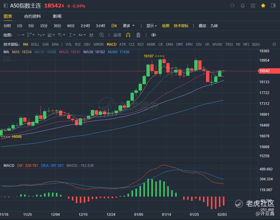 從技術走勢圖上分析,A50指數回落30日均線18028已經找到短線較爲明顯的支撐,以次爲依託展開反彈,如果春節前市場足夠強勢,那麼則有可能重新去測試前高19107,反之,如果市場信心不夠,那麼節前也只好陷入區間震盪,等待過節期間的一些基本面指引。