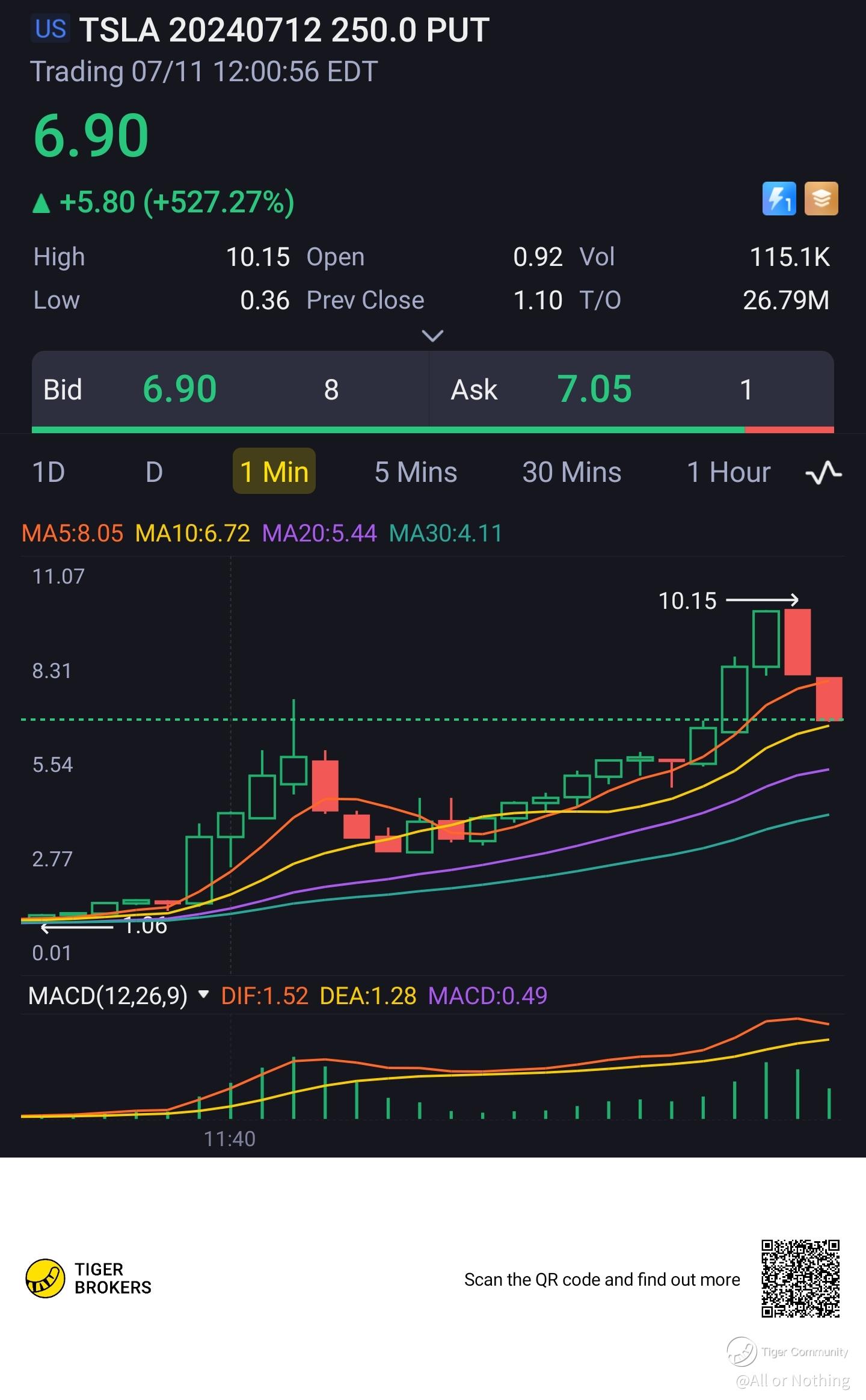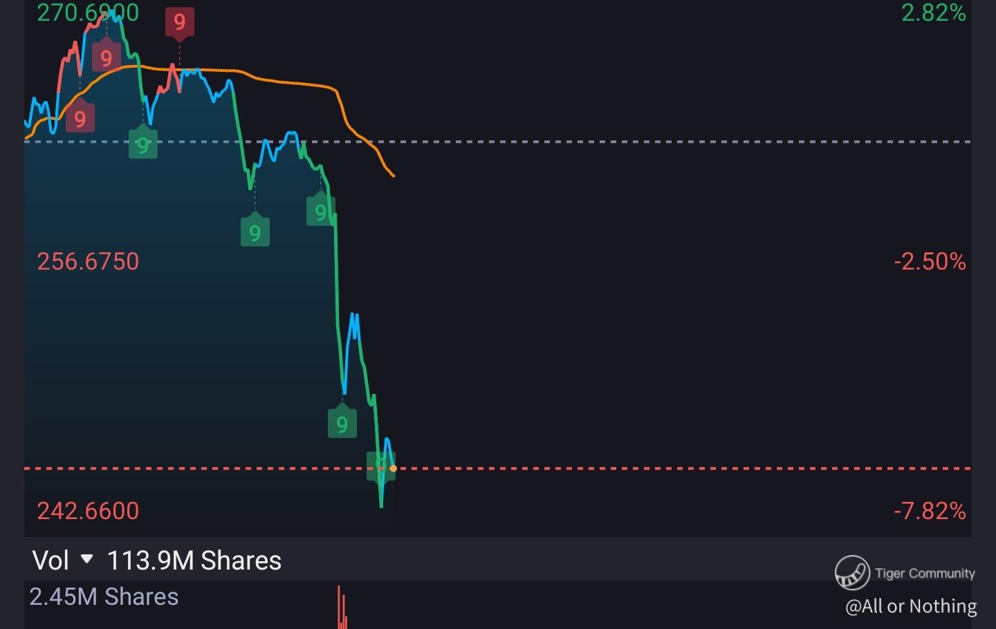 Just about 30 minutes ago, $Tesla Motors(TSLA)$ reached to a high around $270 and started its terrific descent to around $240. Which might end it's 11 straight gains in a row.