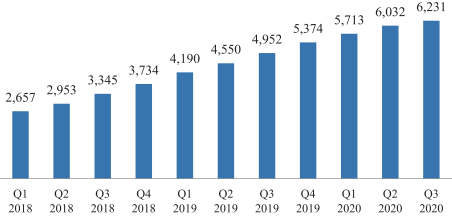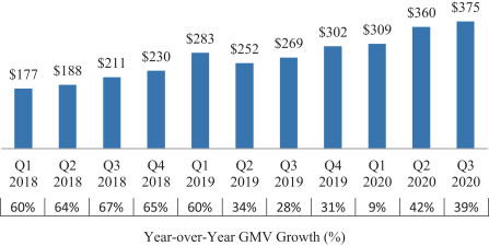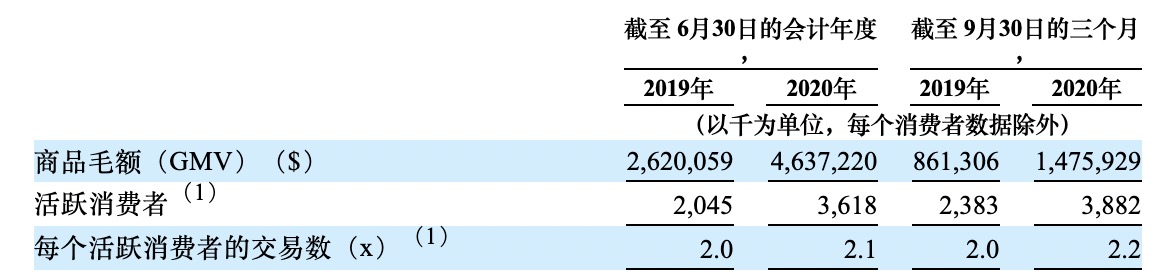 活躍消費者定義爲在評估日期之前的12個月內至少在平臺上進行了一筆交易的消費者。截至2020年6月30日,有360萬活躍消費者,比2019年6月30日增加了約77%。