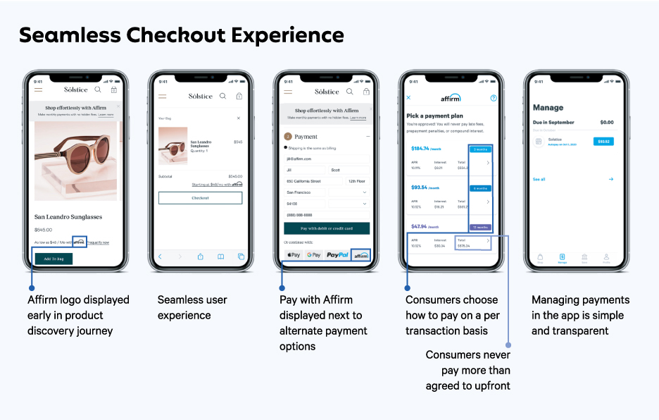 在線貸款支付平臺Affirm於2012年成立,與超過6500家商戶平臺合作,通過接入其支付手段實現“現在購買,以後付款”(如下圖),幫助這些商戶和平臺推動銷售,提高平均訂單價值,並提高回購率。