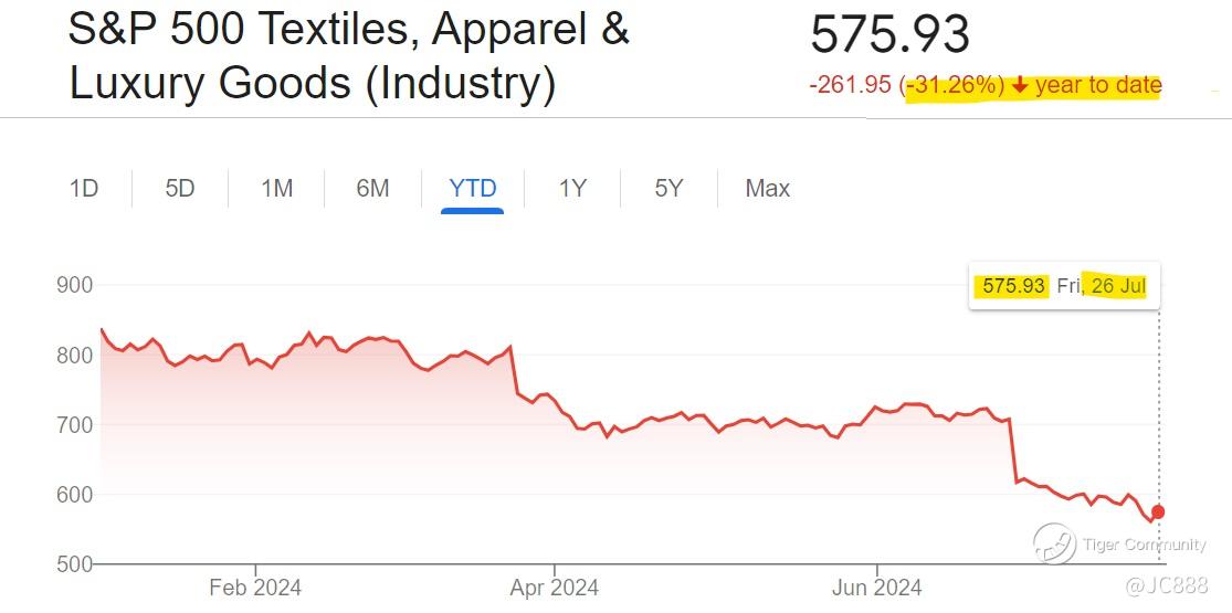 With the world’s top two luxury conglomerates reporting weaker sales, it is not difficult to see why the S&P 500 Textiles Apparel & Luxury Goods Industry Index has slumped -31.26% YTD.