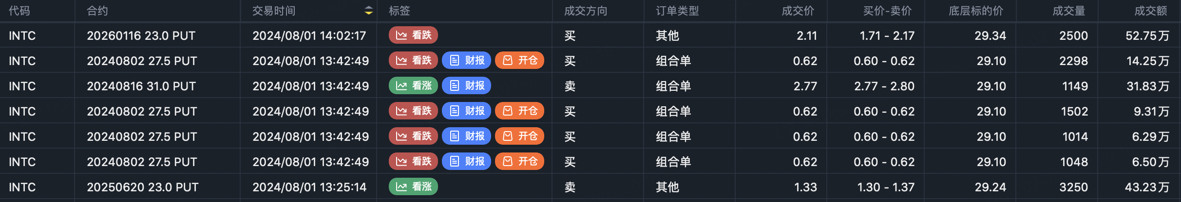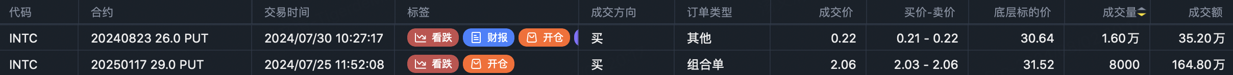 But sorting by trade date, the lowest strike traded on Friday was the INTC 20260116 23 Puts - completely overshooting the worst-case targets.