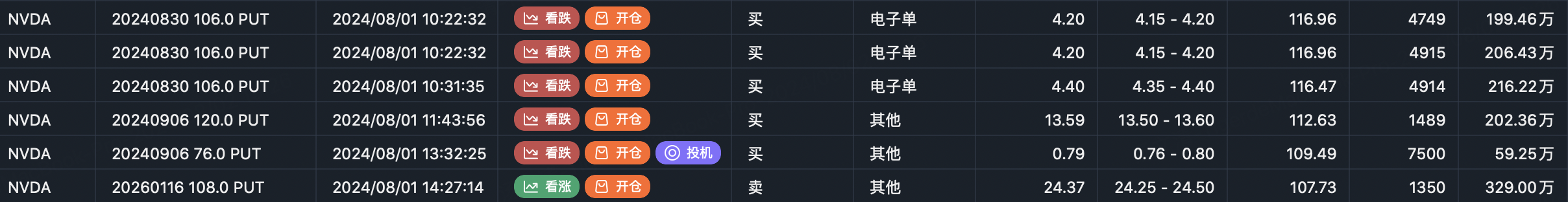 Thursday saw outright put buying like the NVDA 20240830 106 Puts and NVDA 20240906 75 Puts.