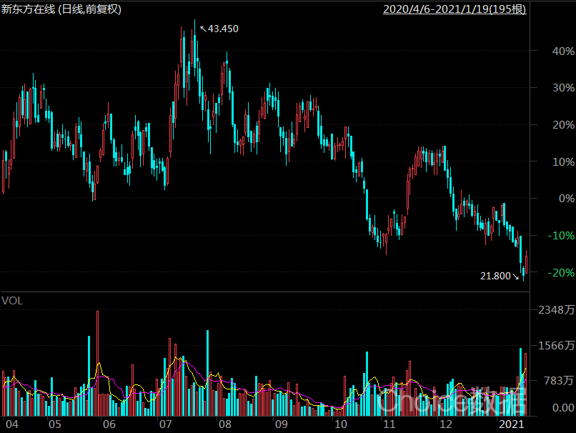 不過,從從新東方在線2020年股價高點43港元跌到現在23.85港元(截至2021年1月19日收盤),投資人的耐心究竟還有多少,也要打一個問號。