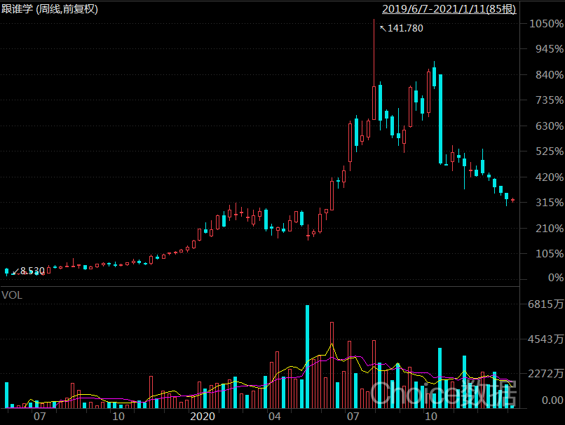 留存在微信羣中的用戶,無需付費即可反覆觸達轉化,從而降低跟誰學獲客成本,這也讓跟誰學通過降低流量成本,成就唯一一個成功盈利的在線教育公司,市值成功暴漲。