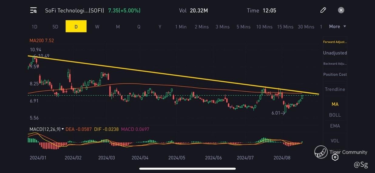 $SoFi Technologies Inc.(SOFI)$ $SOFI's price at $7.52 coincides with its 200-day moving average, which is also a key breakout point. The yellow line on the chart aligns with the $7.52 breakout level, and the MACD turning green signals a positive uptrend. From a technical standpoint, this sets up as a strong short-term trade opportunity.