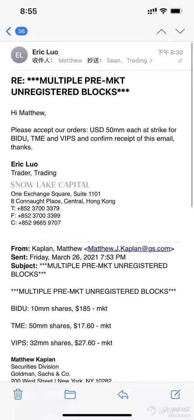 還有網傳的雪湖的接盤郵件,想吃掉百度、騰訊音樂、唯品會各5000萬美金的量。似乎佐證了GS在拉皮條尋求交易的事實。當然我不知道雪湖的內控是咋搞的,這種郵件也能泄露出來,這還不得打屁股。當然也有可能是PS的who knows。