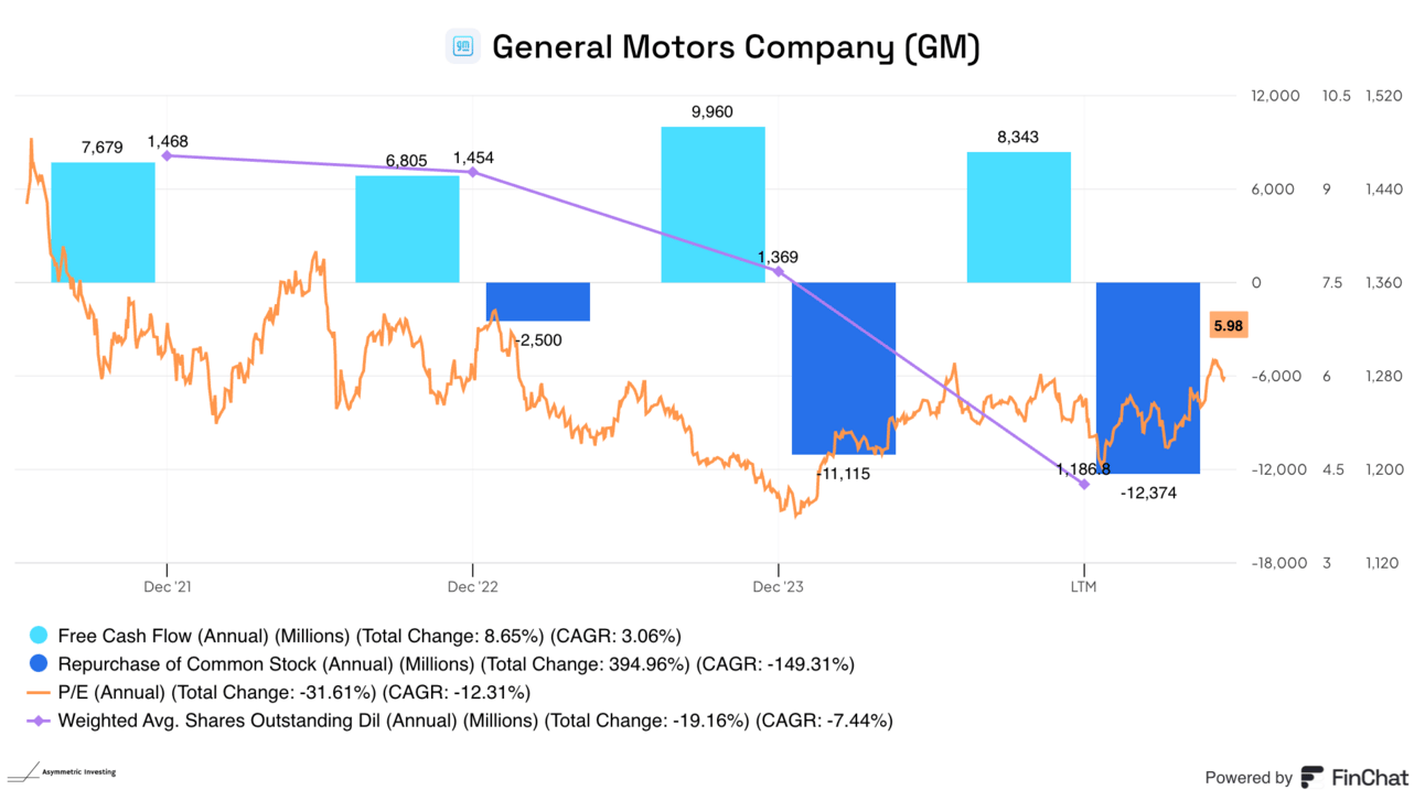 I’ll start with General Motors, which is already up 61.4% since the spotlight article last year. In November 2023, when the P/E multiple of the stock was 4x, management initiated a $10 billion buyback program. They added another $6 billion in buybacks this year. The share count is already down 19% and will go under 1 billion shares outstanding early in 2025, about a 1/3 reduction in two years.