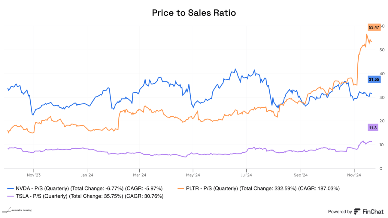 Look at the price-to-sales ratio of three popular stocks today: $NVIDIA Corp(NVDA)$ $Tesla Motors(TSLA)$ $Palantir Technologies Inc.(PLTR)$. NVIDIA and Palantir both trade for over 30x sales, and while their businesses may be doing well, that price puts a lot of downside risk on the table for investors.