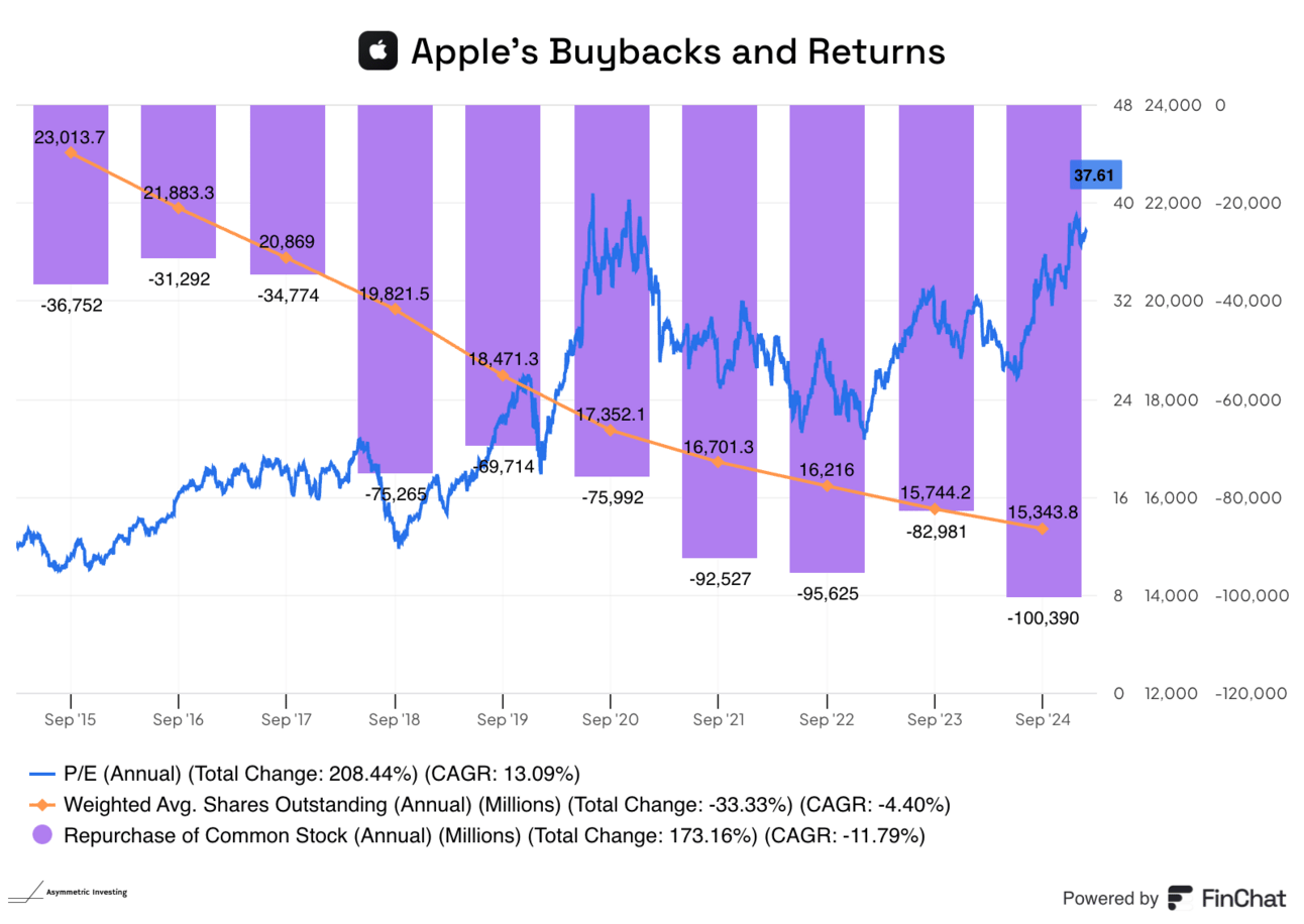 The impact on Apple’s stock was fewer shares outstanding when the multiple shot higher late in the decade. This is simple math.