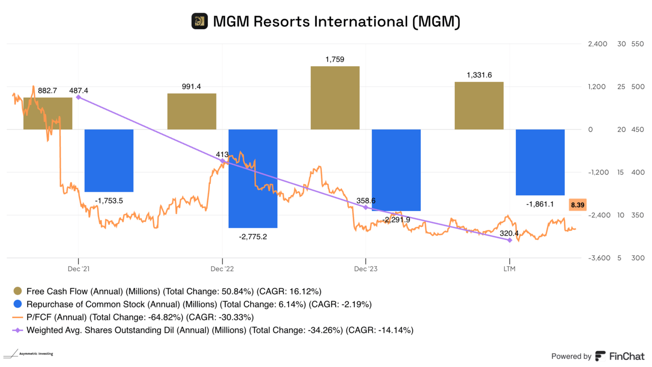 Another favorite of mine is $MGM Resorts International(MGM)$ , which has bought back 34% of its shares since 2021. It has a solid cash flow business in a regulated environment and a very low valuation (price to FCF shown here).