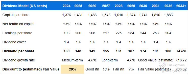 Cash that was previously returned through buybacks is now redirected to dividends, but at a more conservative level than before. As a result, the dividend increases from $1.01 in 2023 to $1.38 in 2024, and dividend cover falls to 1.4, where it remains indefinitely.