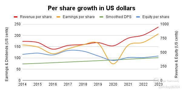 However, despite increases in revenue, earnings, and dividends, the company’s shareholder equity has declined over the past ten years. This decline is evident both in absolute terms and on a per-share basis (measured in U.S. dollars, which I’ll use for all of Diageo’s historical results moving forward).