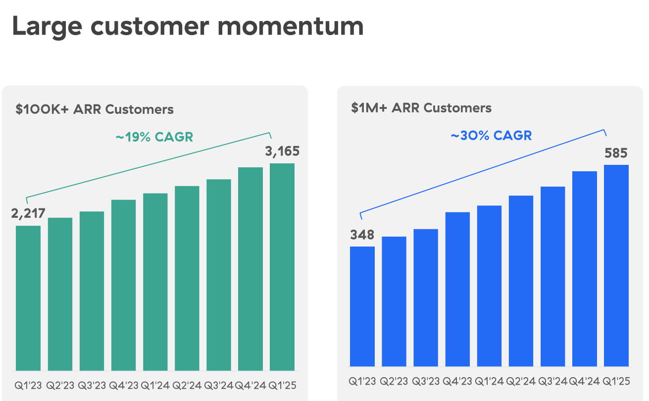 Large customer retention: 100K+ large customers rose to 3,165, while 1M+ large customers rose to 585, a 30% CAGR from Q1 2023.