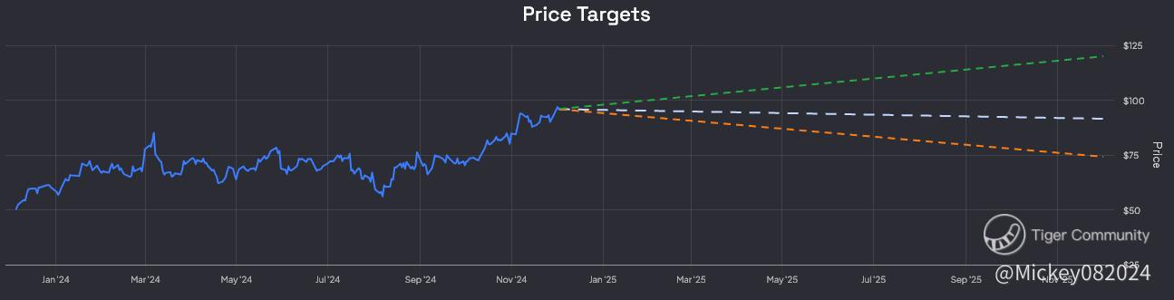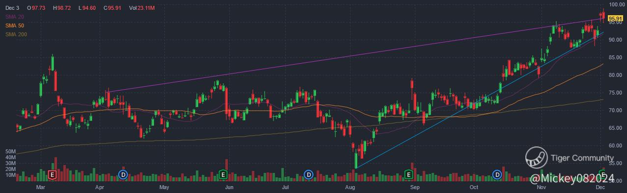 Support and Resistance: The stock is approaching critical resistance levels around $100, with strong support near $90. If the stock breaks the resistance, it could indicate further upward movement. Failure to maintain momentum might lead to a consolidation or a pullback to support.
