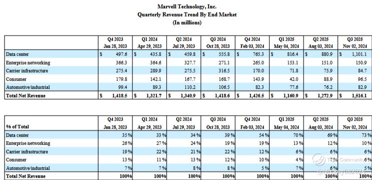 Data center product sales surged, doubling year-over-year to reach $1.1 billion in the latest quarter, increasing their share of total revenue from 39% in October 2023 to 73% this quarter. This shift underscores Marvell's successful pivot toward AI and cloud-driven markets.