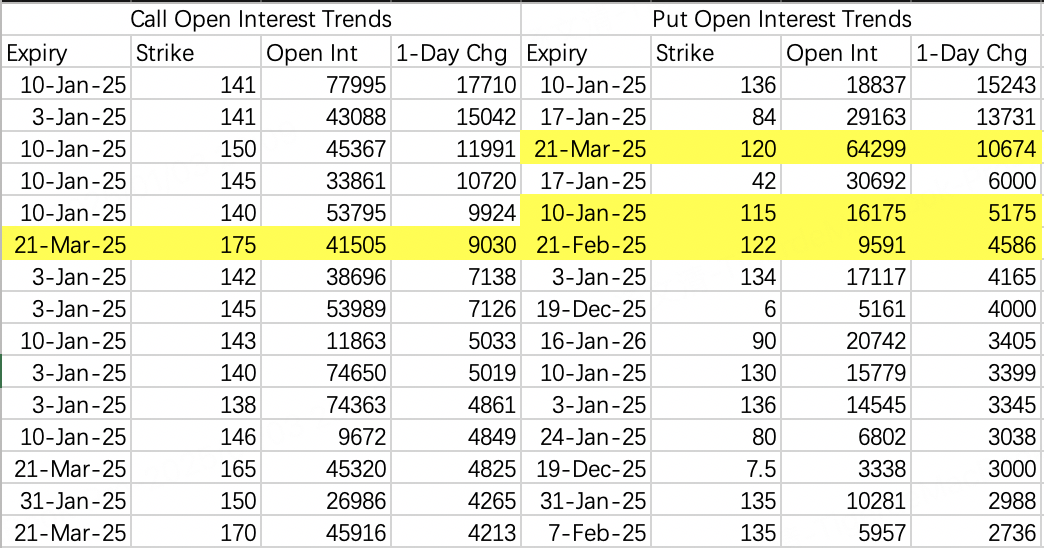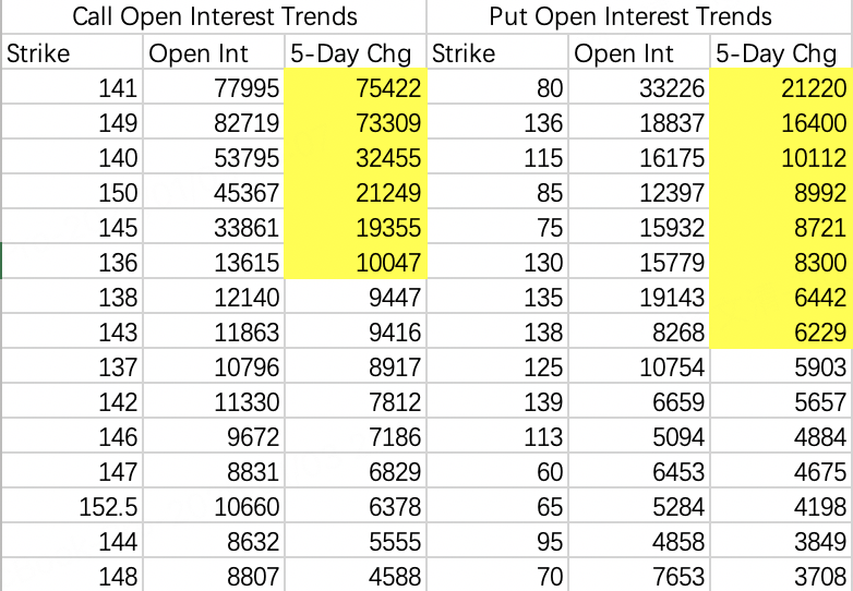 For options expiring next week on the 10th, looking at new positions opened in the last 5 days by volume, two extremes emerge - either the stock price will hover between 135-141, or head towards 150.