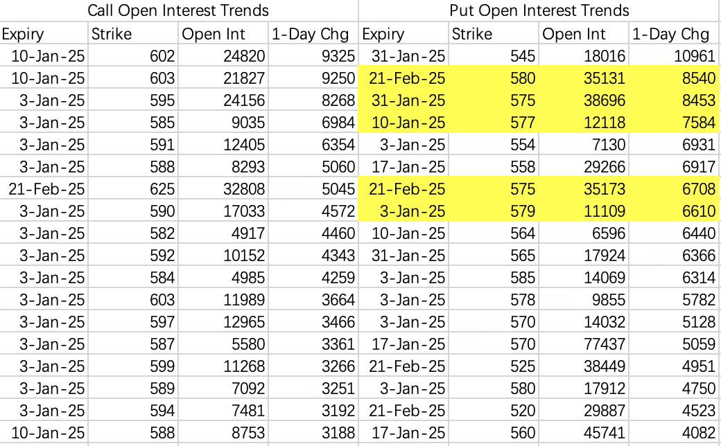 Top put positions for SPY are concentrated in the 570-580 range for the three weeks after January. The trend suggests a downward test of 570-580 between January 10-17, with a rebound in the last week of January.