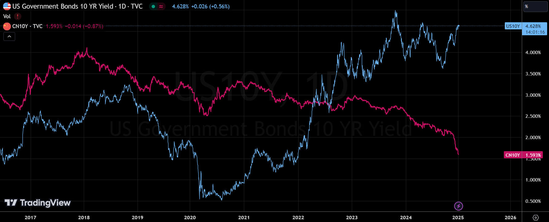 At the same time, the external environment is even worse, the strong U.S. dollar, U.S. bonds running high, but the rapid decline in Chinese bond rates, the U.S.-China interest rate spreads continue to widen, the weakening of the yuan, leading to the accelerated withdrawal of active foreign capital.The change in treasury rates reflects the market's expectation of monetary policy easing, but also reveals concerns about economic growth and investment returns.Historical experience has shown that a widening of the US-China interest rate spread tends to pressurize the market and cause capital outflows.