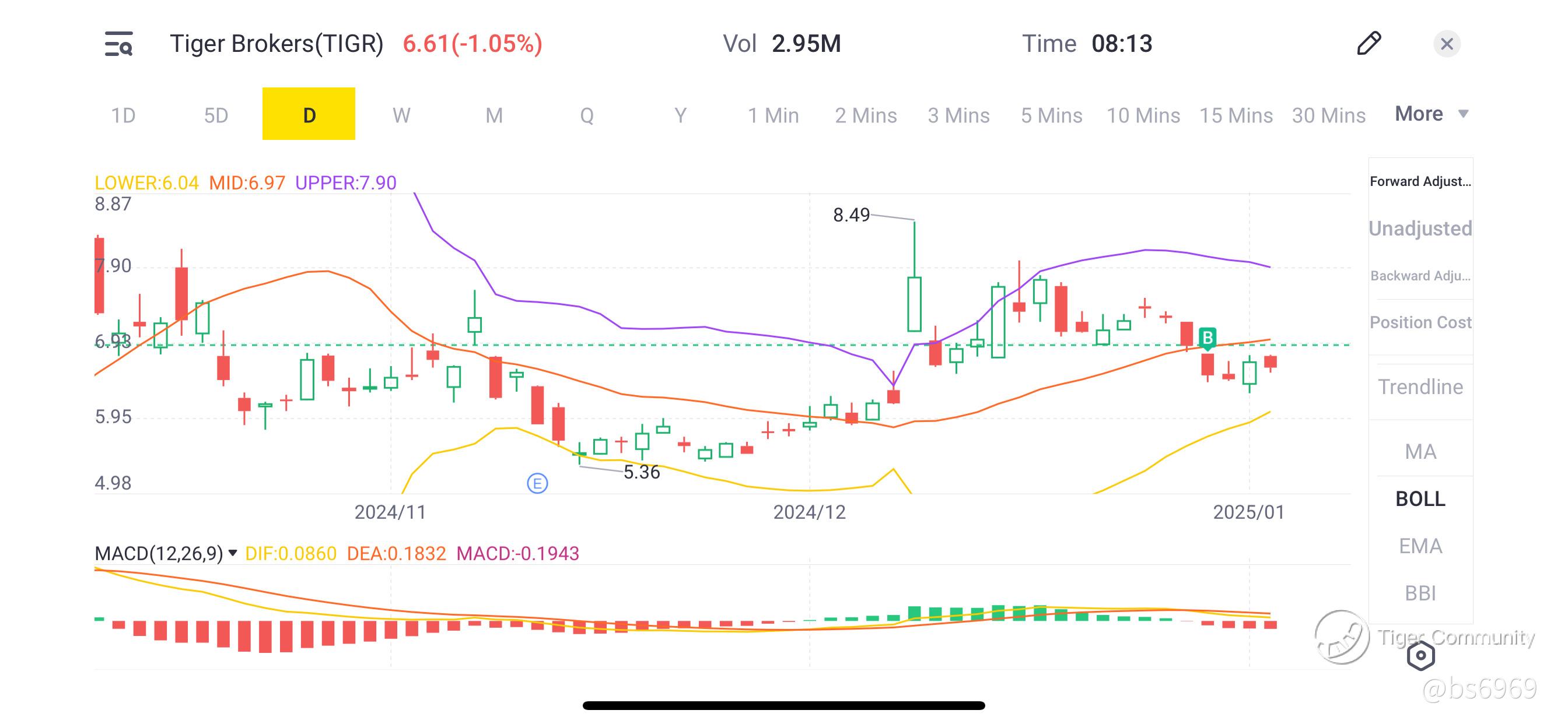 If TIGR holds above $6.97 and confirms strength, the next resistance levels to watch are $7.50 and $7.90 (upper Bollinger Band). A breakout above these levels could push the stock toward the previous high of $8.49. Traders should monitor volume on the breakout—high volume confirmation would solidify the bullish trend.