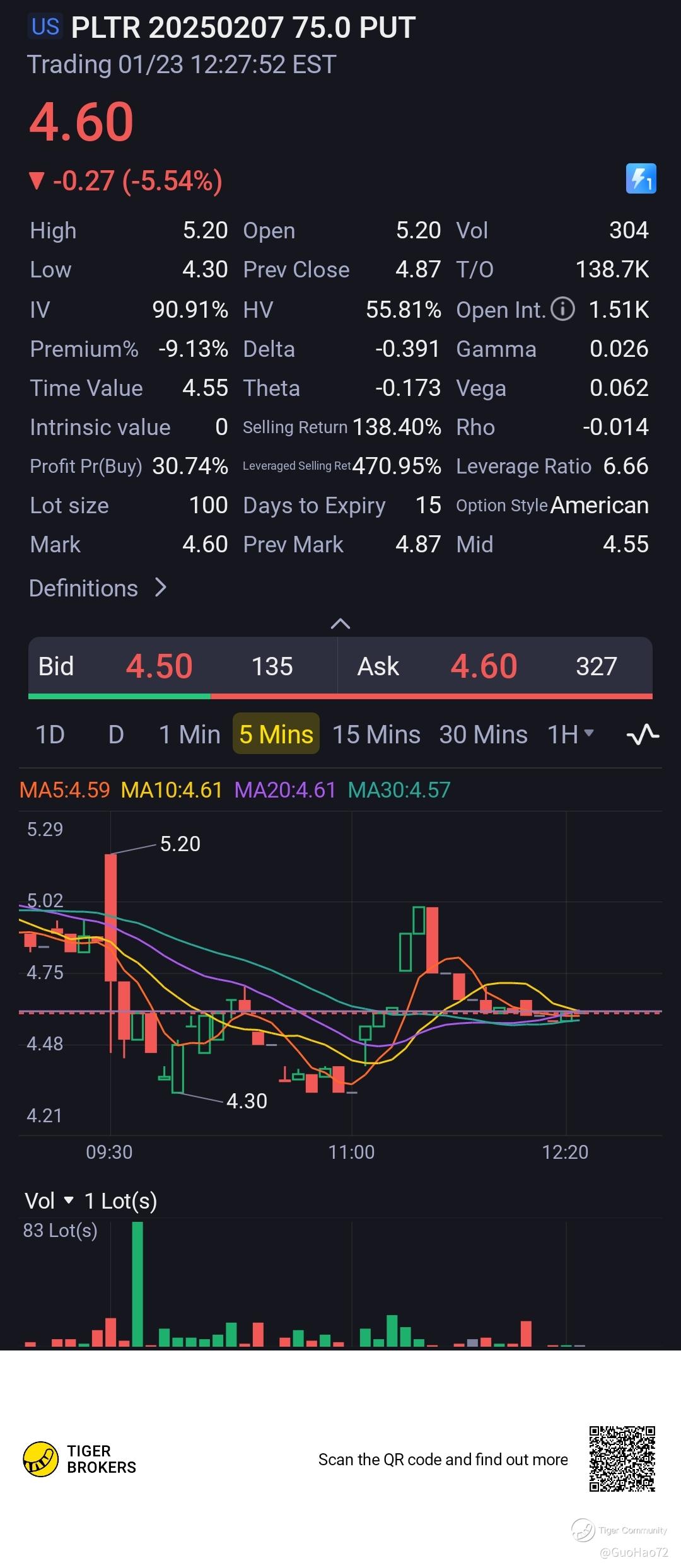 $PLTR 20250207 75.0 PUT$ Earnings coming, many investors will take profit and stay out given the extreme overvaluation. I will be taking profit if PLTR reaches below 70 and exit before expiry.