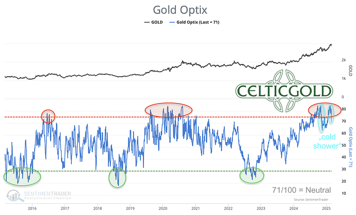 After the healthy cool-down in November and December, sentiment in the gold market quickly became euphoric again since the beginning of the year. However, thanks to the sharp pullback from USD 2,956 to USD 2,832, a considerable amount of hot air has already escaped. Currently, the Sentiment Optix for gold stands at 71 out of 100 points, just below the euphoria zone.
