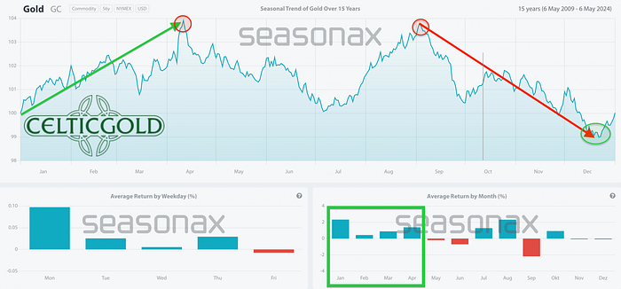 Seasonality for gold over the last 15-years as of May 6th, 2024. Source: Seasonax