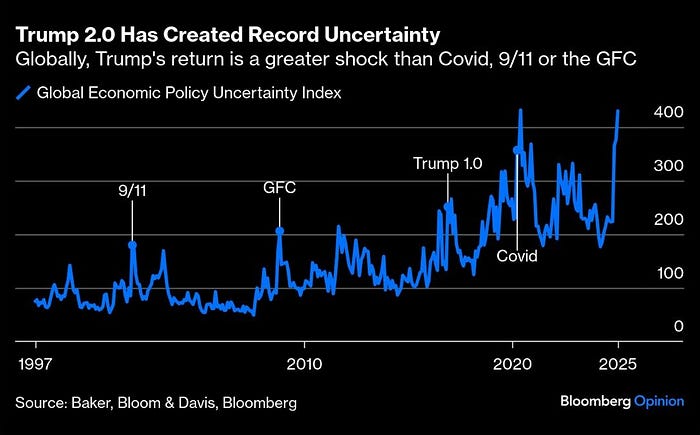 Trump 2.0 has created record uncertainty. Source: Baker, Bloom & Davis, Bloomberg