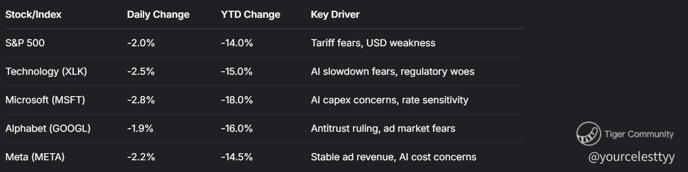 • Meta’s Resilience: META has held up better, down 14.5% YTD, thanks to steady ad revenue, though its heavy AI investments (e.g., LLaMA models) are under scrutiny for profitability.