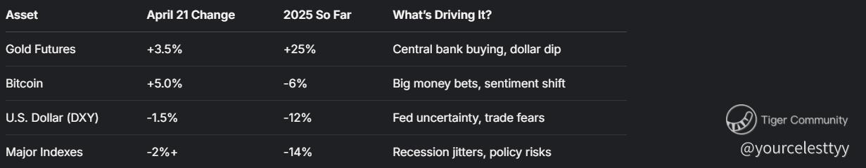 On April 21, 2025, the U.S. markets faced a brutal "Black Monday." Stocks tanked, with all three major indexes—the Dow, Nasdaq, and S&P 500—dropping over 2%. The U.S. Dollar Index (DXY) slid below 98, a level not seen in years. Meanwhile, gold futures soared past $3,500, and Bitcoin surged back above $88,000. This unusual tandem rally of gold and Bitcoin against a weakening dollar has sparked a big question: Is Bitcoin finally proving itself as "digital gold" and a reliable safe-haven asset? Let’s dive into the chaos and see what’s really happening.