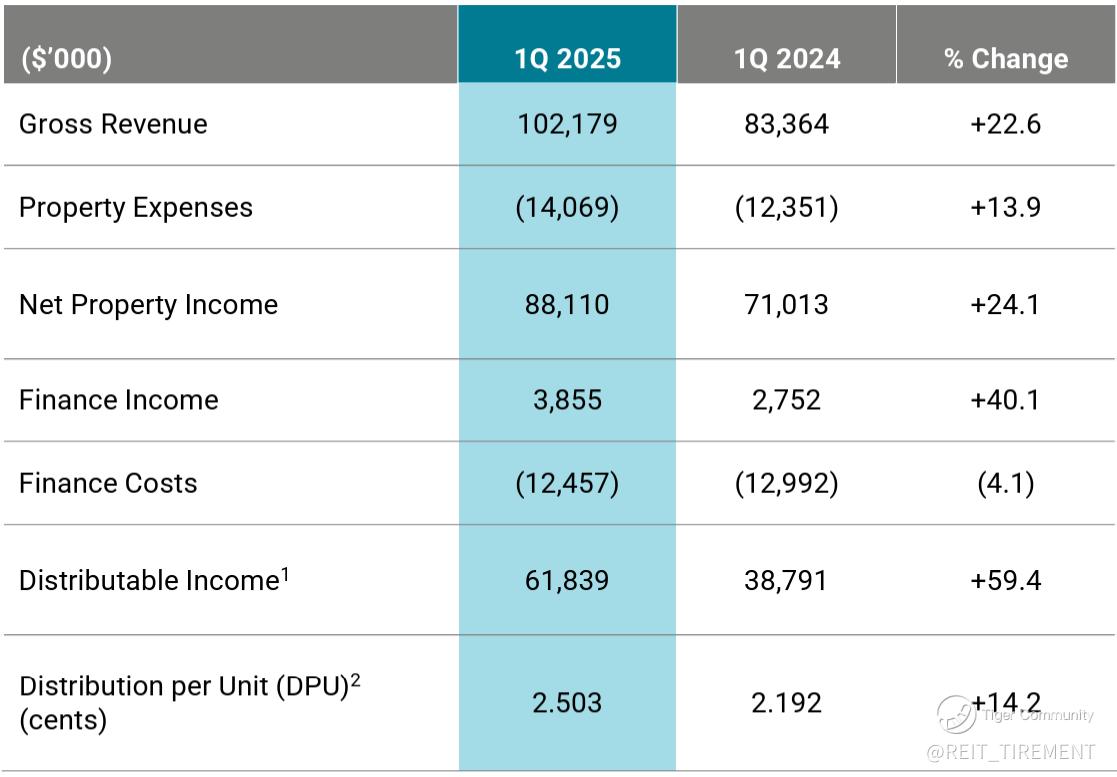 KDC delivered a strong YoY performance for 1Q 2025, with improvements across gross revenue, NPI, finance income, distributable income, and DPU. Key drivers include: