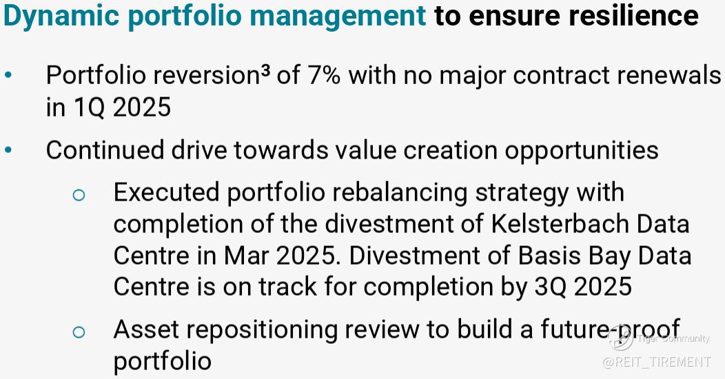 KDC recorded a 7% rental reversion in 1Q 2025. In terms of portfolio rebalancing:
