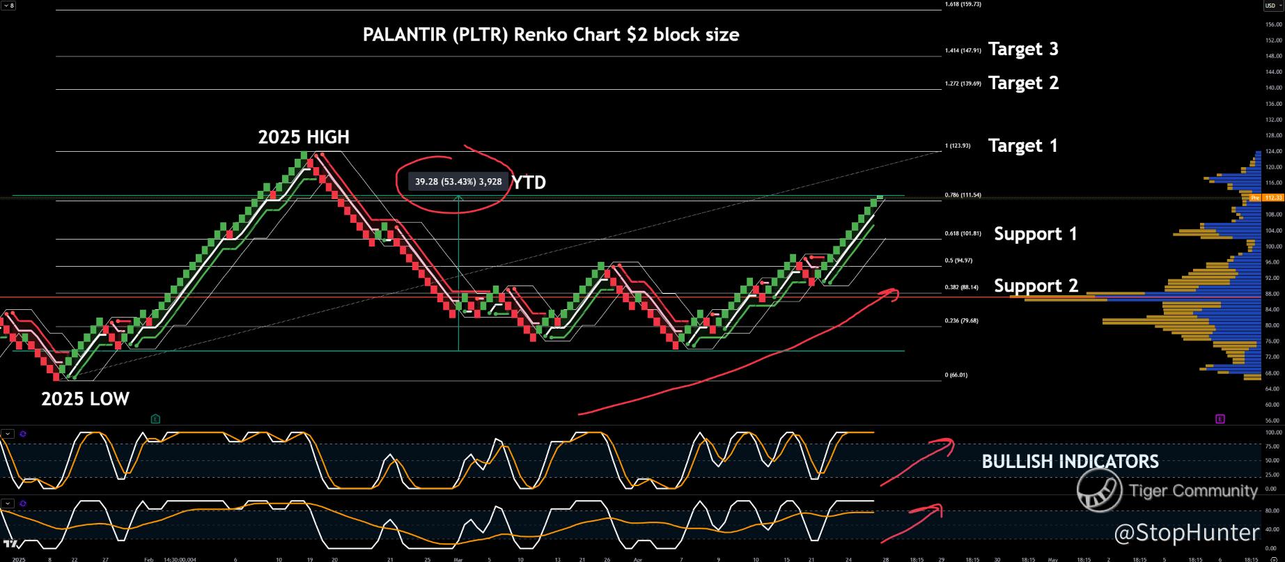 Chart: Up 53% YTD. Consensus: Bullish, Targets: Upside: Highs at 123 / 124 USD, then: 140, 148, 160. Downsides:102 USD, then 95, 88 (Point of control 2025), 80.