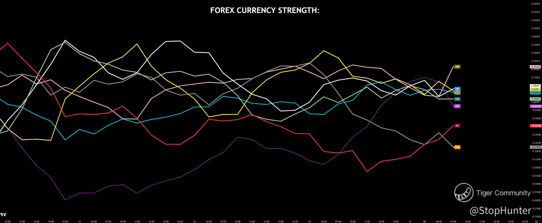 GBP - picking up strength as is JPY and USD. NZD, CHF, AUD weakening - potential trades: +GBPAUD + GBPNZD, -AUDUSD, - AUDJPY, -NZDUSD, -NZDJPY