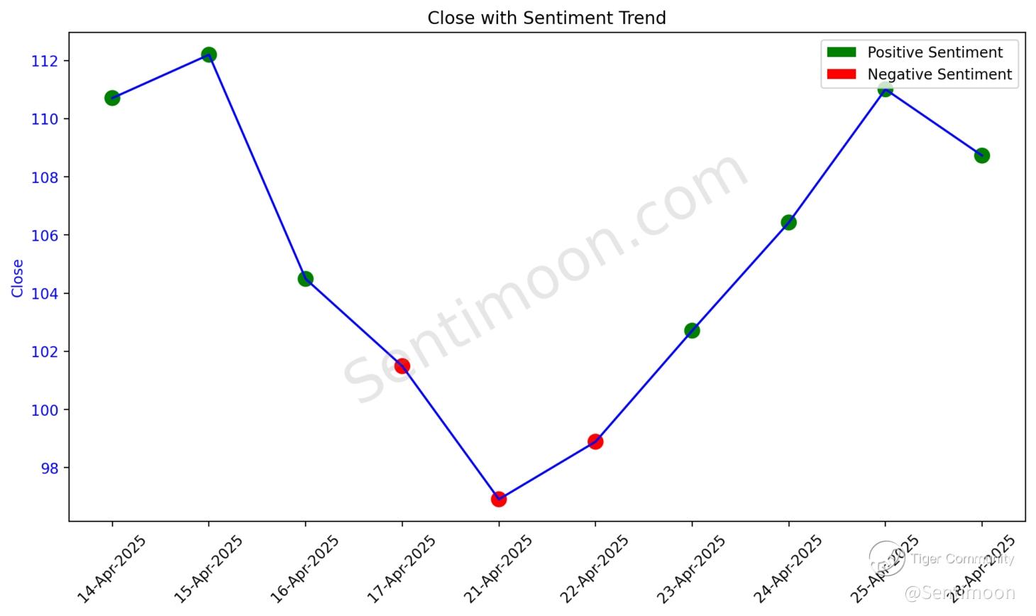 Over the past 10 sessions, the price initially rose from 110.71 to 112.20, followed by a sharp decline to 96.91, before rebounding to 108.73. The sentiment trend mirrored this volatility, starting bullish (↑) but turning bearish (↓) as prices fell below 101.49. Sentiment improved (↑) again during the recovery, particularly as prices climbed above 102.71, reflecting renewed optimism despite recent fluctuations.