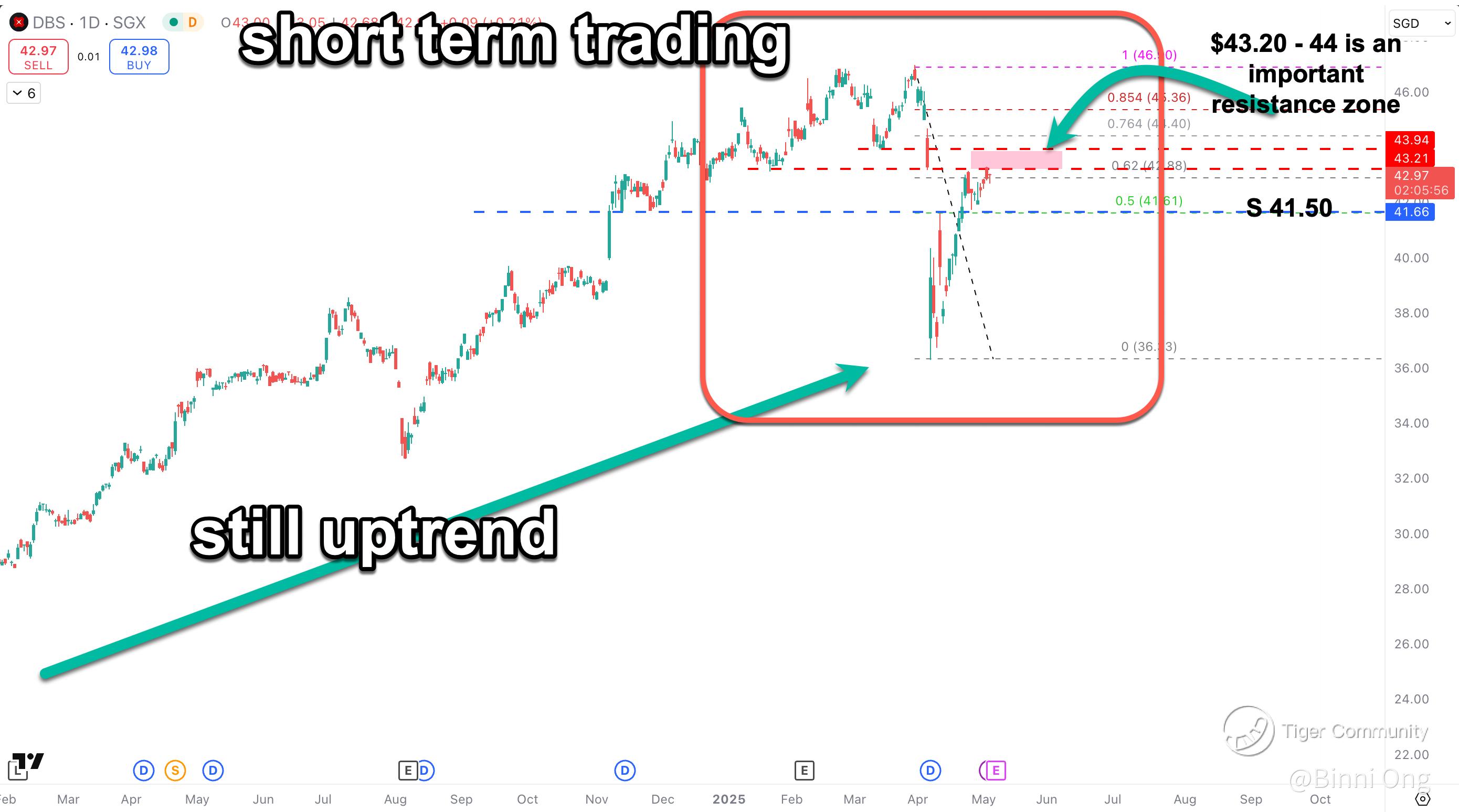If price faces rejection at resistance or breaks below 41.60, short DLCs ( $DBS 5xShortSG261217(SZWW.SI)$ may profit from potential pullback or correction.