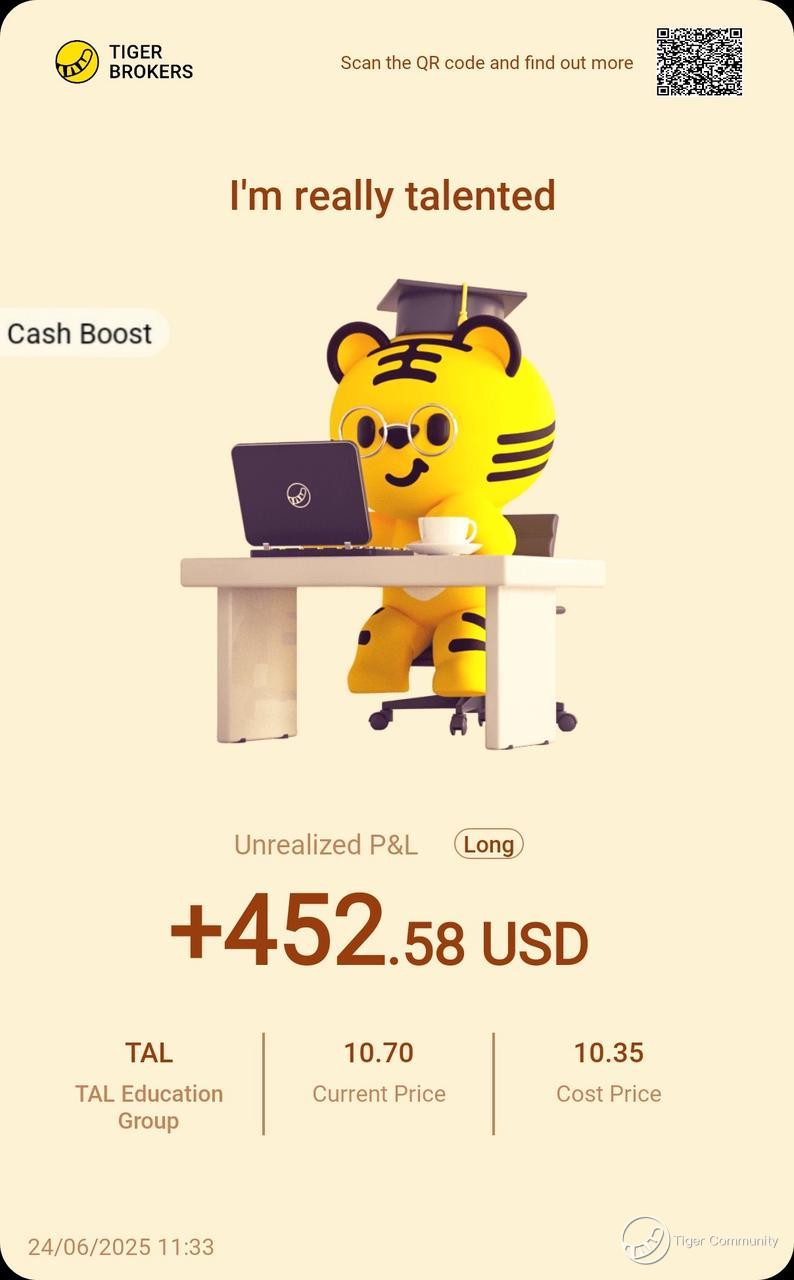 $TAL Education Group(TAL)$ 's education sector rebound executed perfectly! $452.58 profit from 10.35 to 10.70 captures the policy easing momentum. When regulatory clouds lift, few plays are as rewarding as quality education stocks - making this comeback story particularly sweet.