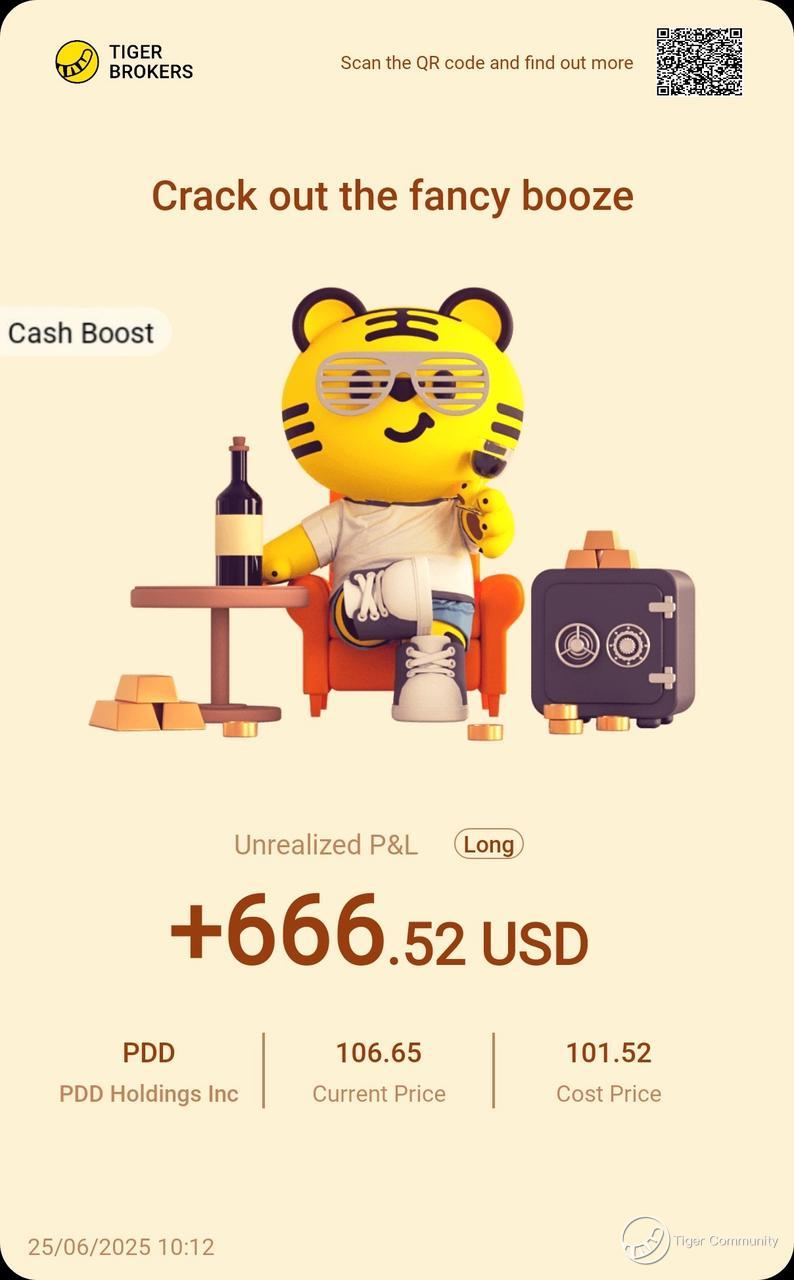$PDD Holdings Inc(PDD)$ delivering that sweet $666.52 unrealized gain! With $106.65 current price cruising past $101.52 cost basis, the e-commerce juggernaut proves its staying power. Time to 'crack out the fancy booze' indeed!