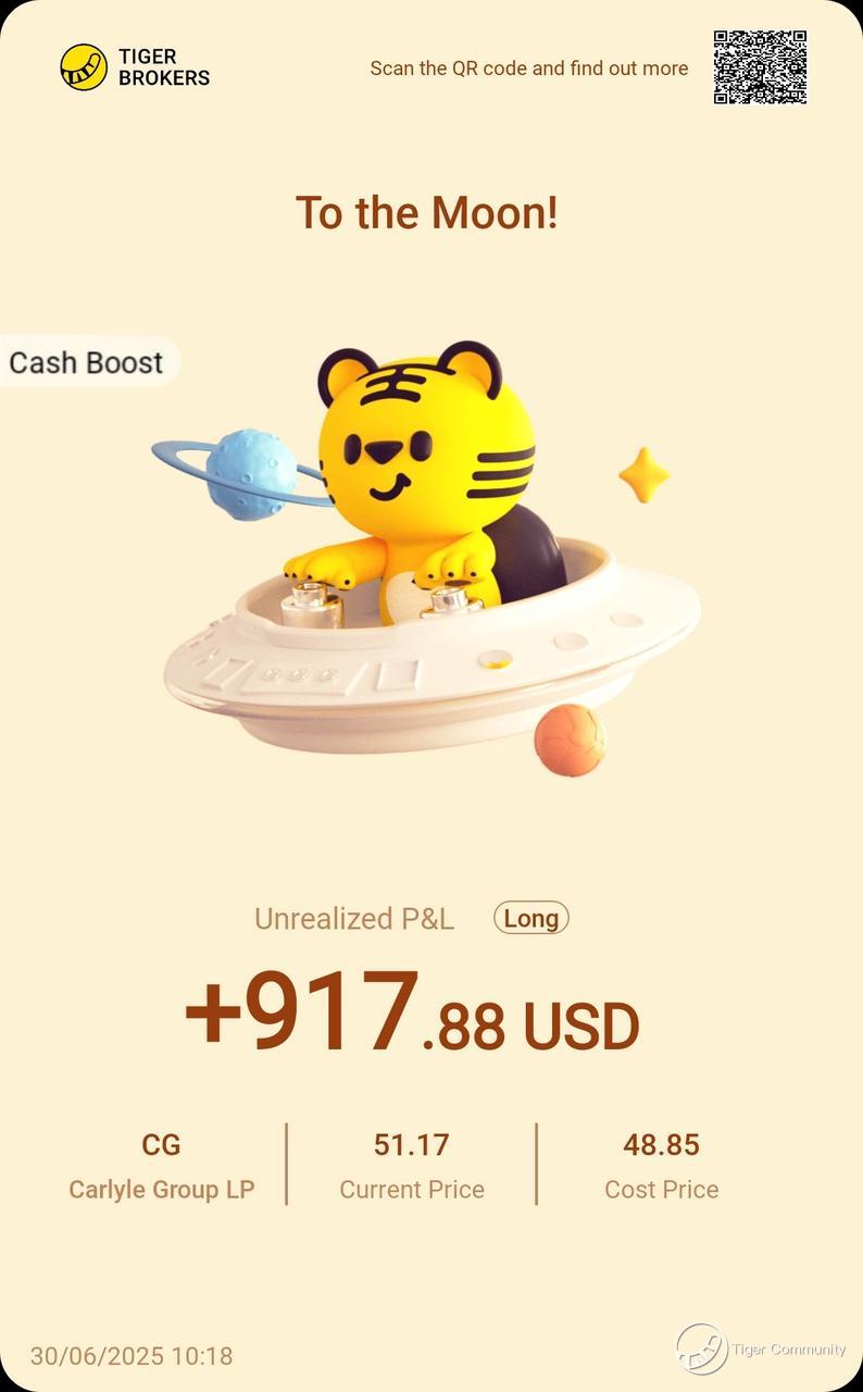 $Carlyle Group LP(CG)$ Another great win! My Carlyle Group position shows an unrealized gain of +917.88 USD, with an entry at 48.85 USD and current price at 51.17 USD. This return not only confirms my investment insight but also reinforces my confidence in the private equity sector. Every market fluctuation presents an opportunity, and holding quality assets with patience always pays off. Staying focused and moving forward steadily on this investment journey!