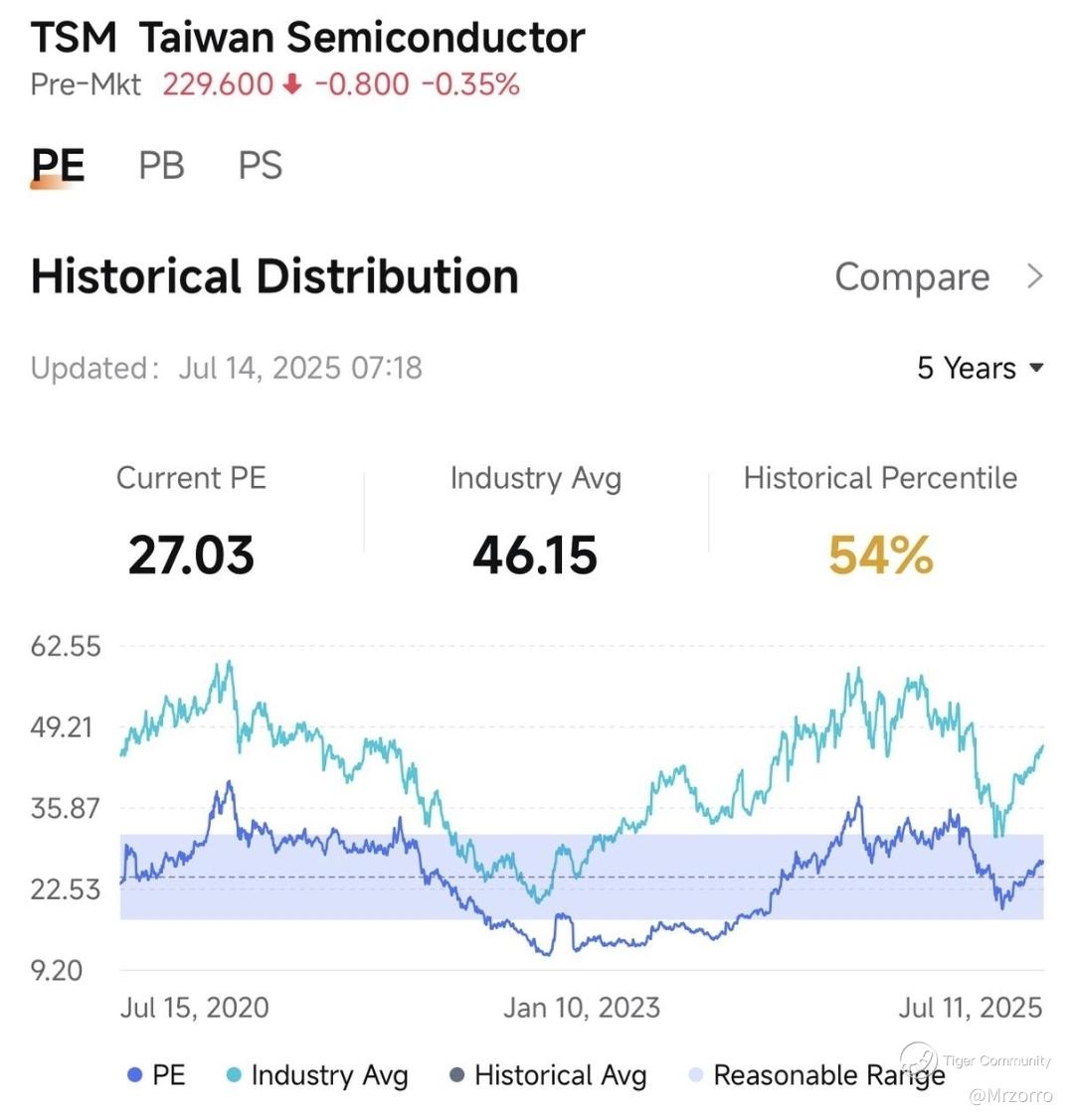 Valuation: TSMC currently trades at a P/E (Price-to-Earnings) multiple of 27.03x, which is within its historical mid-range and below the semiconductor industry average P/E of 46.15x.