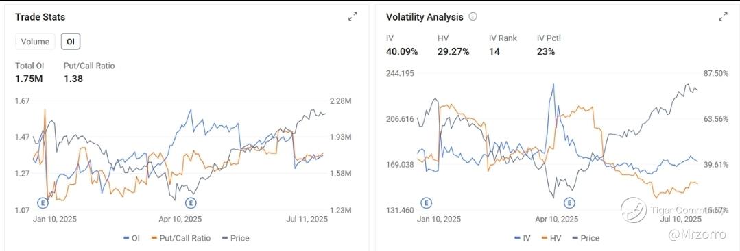From an options perspective, despite a high Open Interest (OI) put/call ratio of 1.38—which indicates strong pessimistic or hedging sentiment in the market—the Implied Volatility (IV) Rank stands at only 14. This suggests that the cost of purchasing options to position for future significant price swings is currently at a relative historical low.