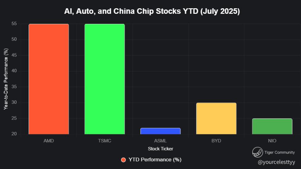AMD’s 6% surge to $185.50, driven by resumed MI308 sales to China, positions it as a compelling alternative for investors who missed Nvidia’s rally. With a 25x P/E, 55% YTD gain, and strong AI chip demand, AMD could hit $200-$210 by year-end if Q2 earnings beat expectations. TSMC and ASML offer robust semiconductor exposure, while BYD and NIO tap into China’s EV and AI-driven auto market. However, tariff risks (30% on EU/Mexico, 35% on Canada), competition from Nvidia and Intel, and geopolitical tensions (Israel-Iran conflict, oil at $75 per barrel) could trigger volatility, with a potential 5-10% S&P 500 pullback to 5,800-6,000. Investors should buy on dips for long-term upside, use options for volatility plays, and hedge with VIXY or GLD to manage risks. The AI and auto chip boom is alive—pick your winners and trade smart.